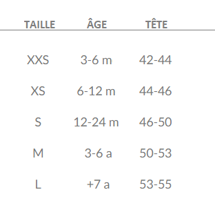 TAILLE M pour enfants de 4 à 8 ans, tissu souple pouvant convenir jusqu'à l'âge de 10 ans. TAILLE S pour enfants de 2 à 4 ans.